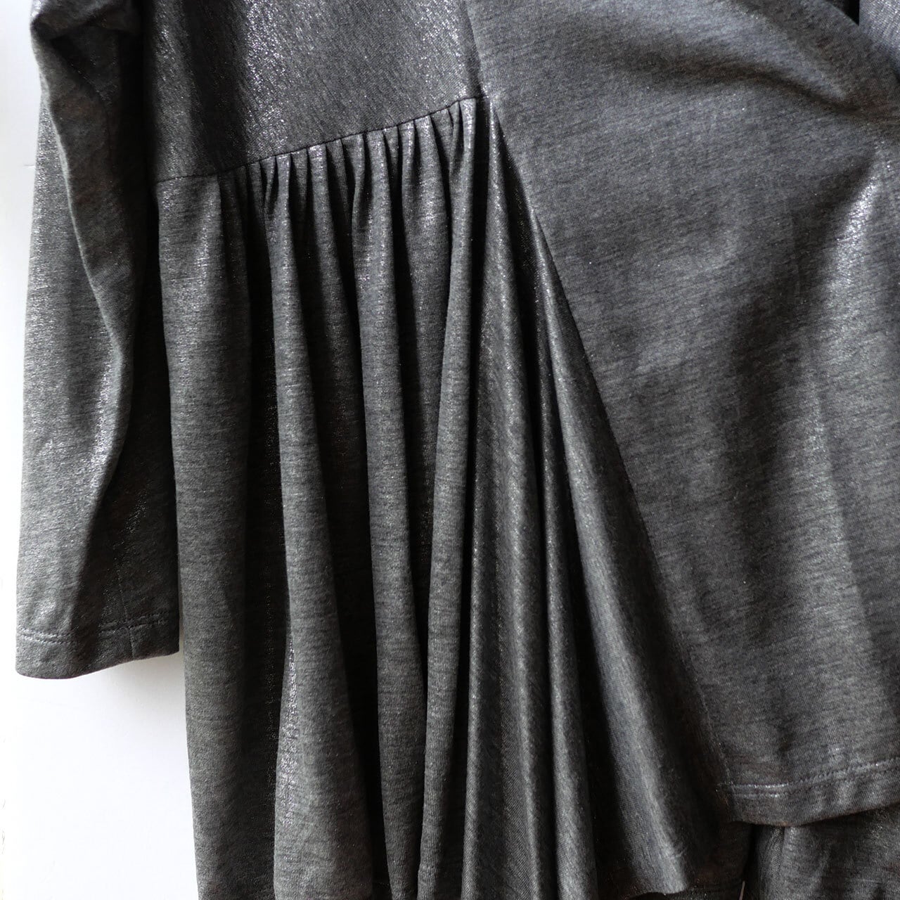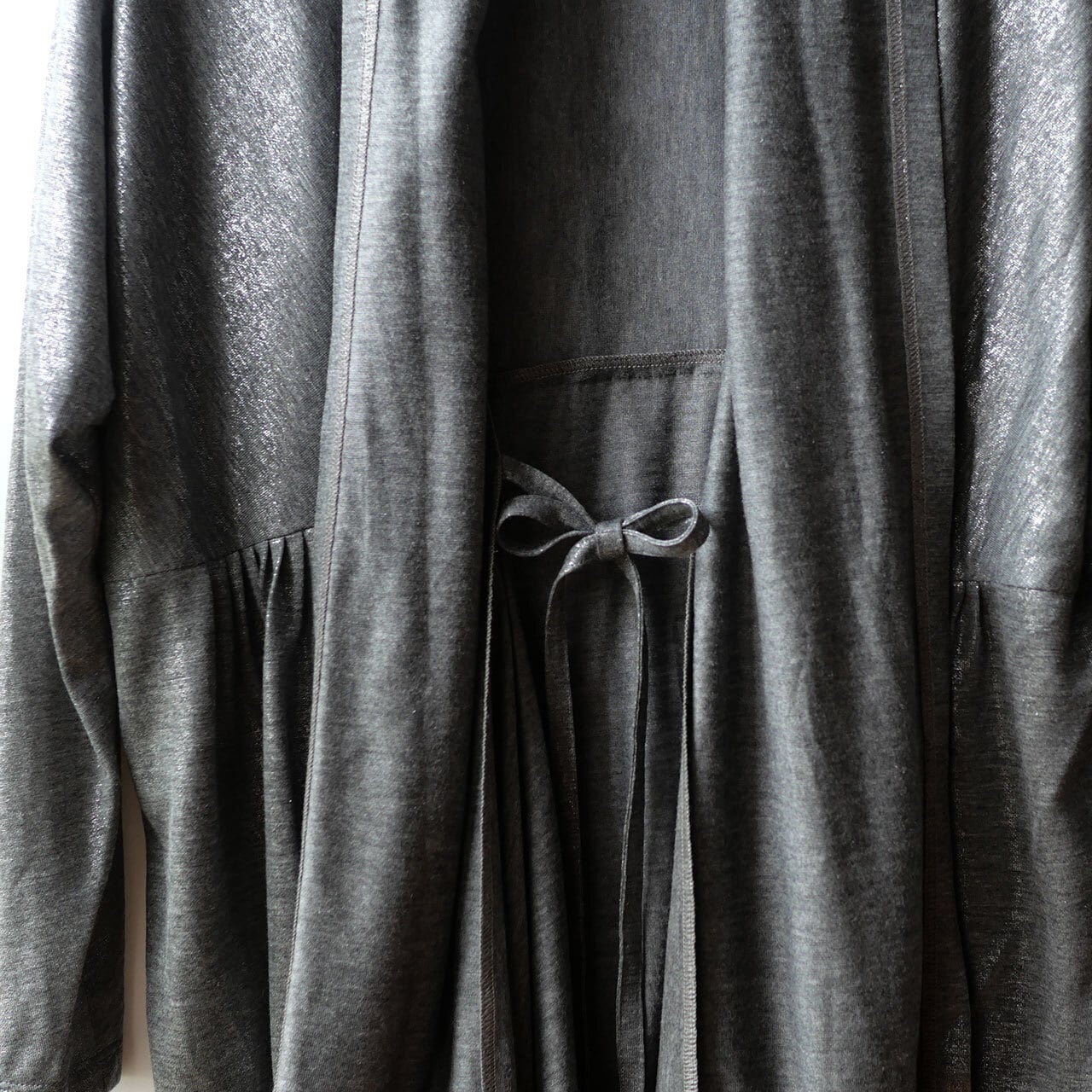 チャコール杢グレーのテロンとした落ち感のある天竺を使用していますので、しなやかに着こなせ、皺にもなりません。この生地の表面は、控えめにシルバーの箔プリントが加工されていて、動くたびに光の吸収率が変わって面白く、かつエレガントな雰囲気もあります。