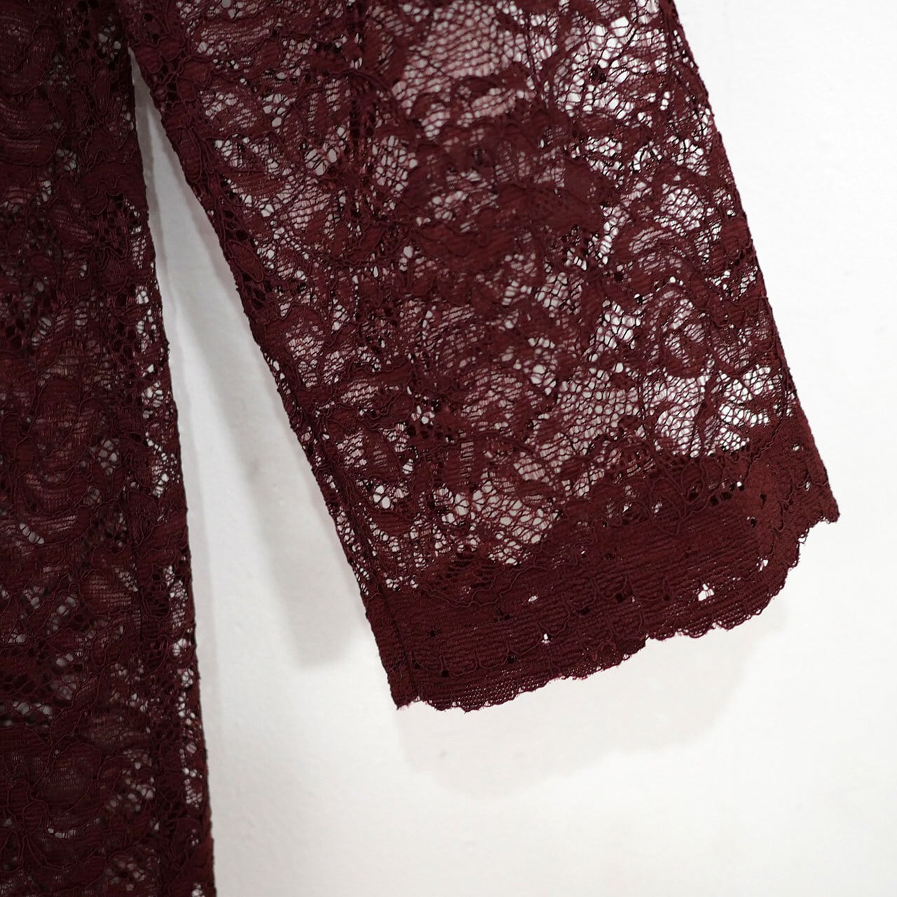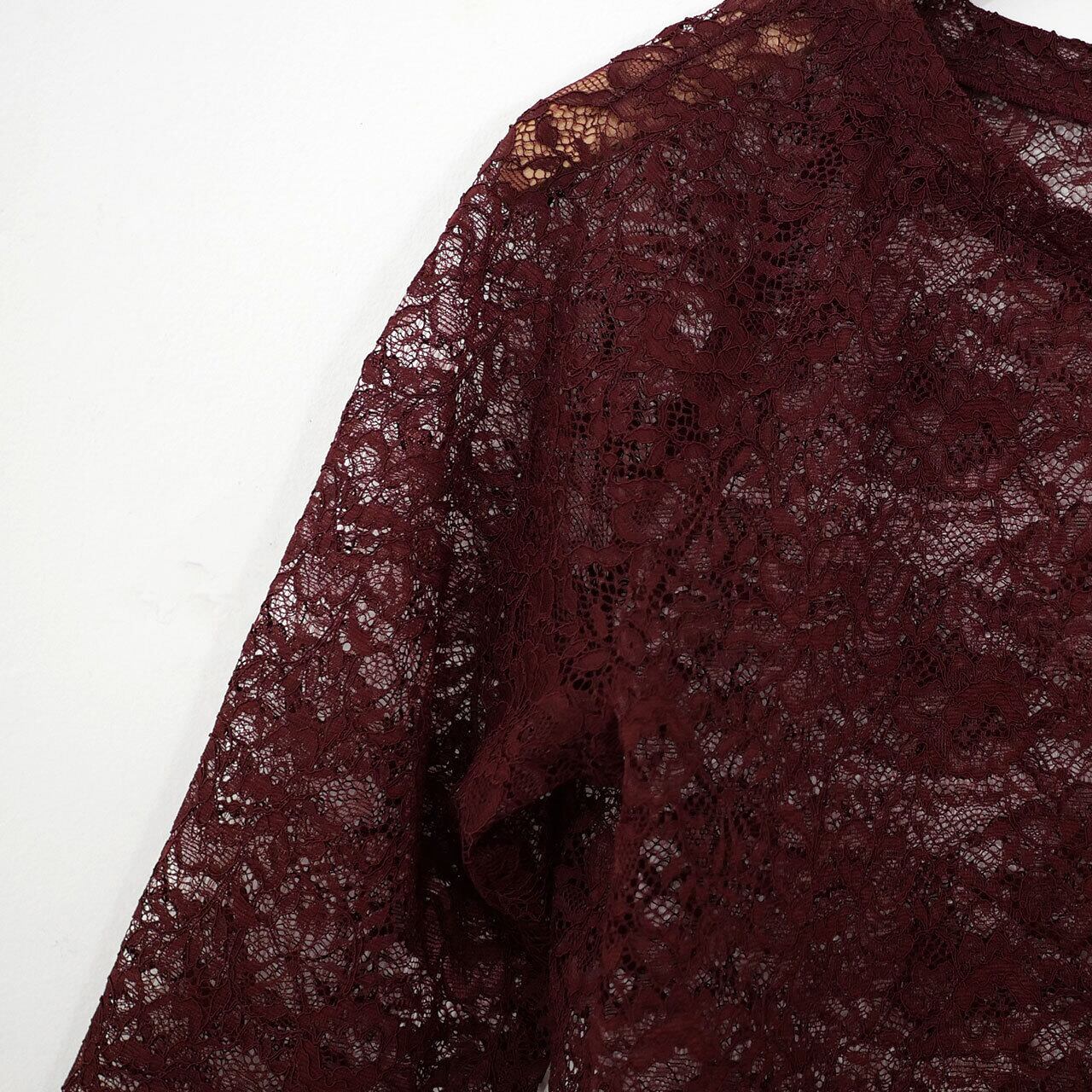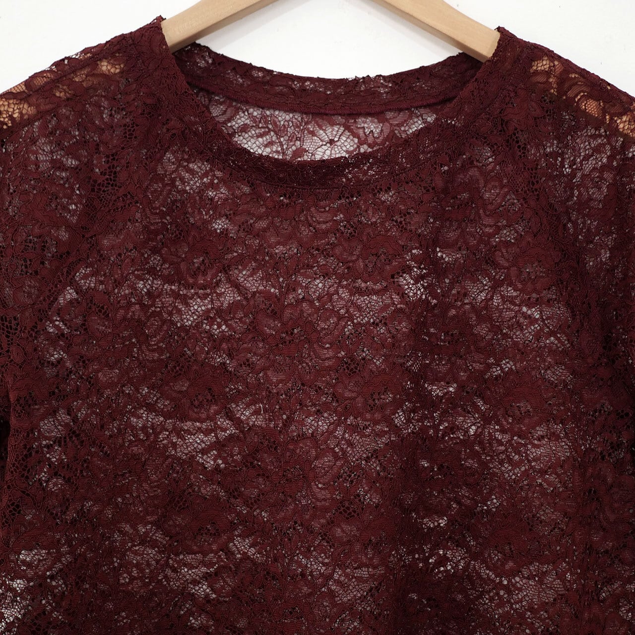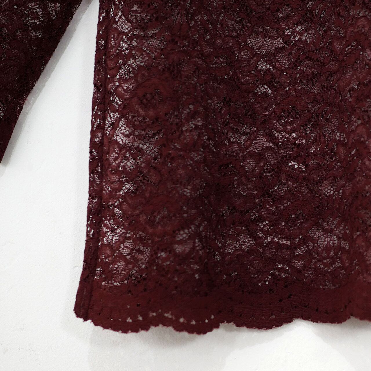 茶色のレース生地で仕立てた七分袖Tシャツです。