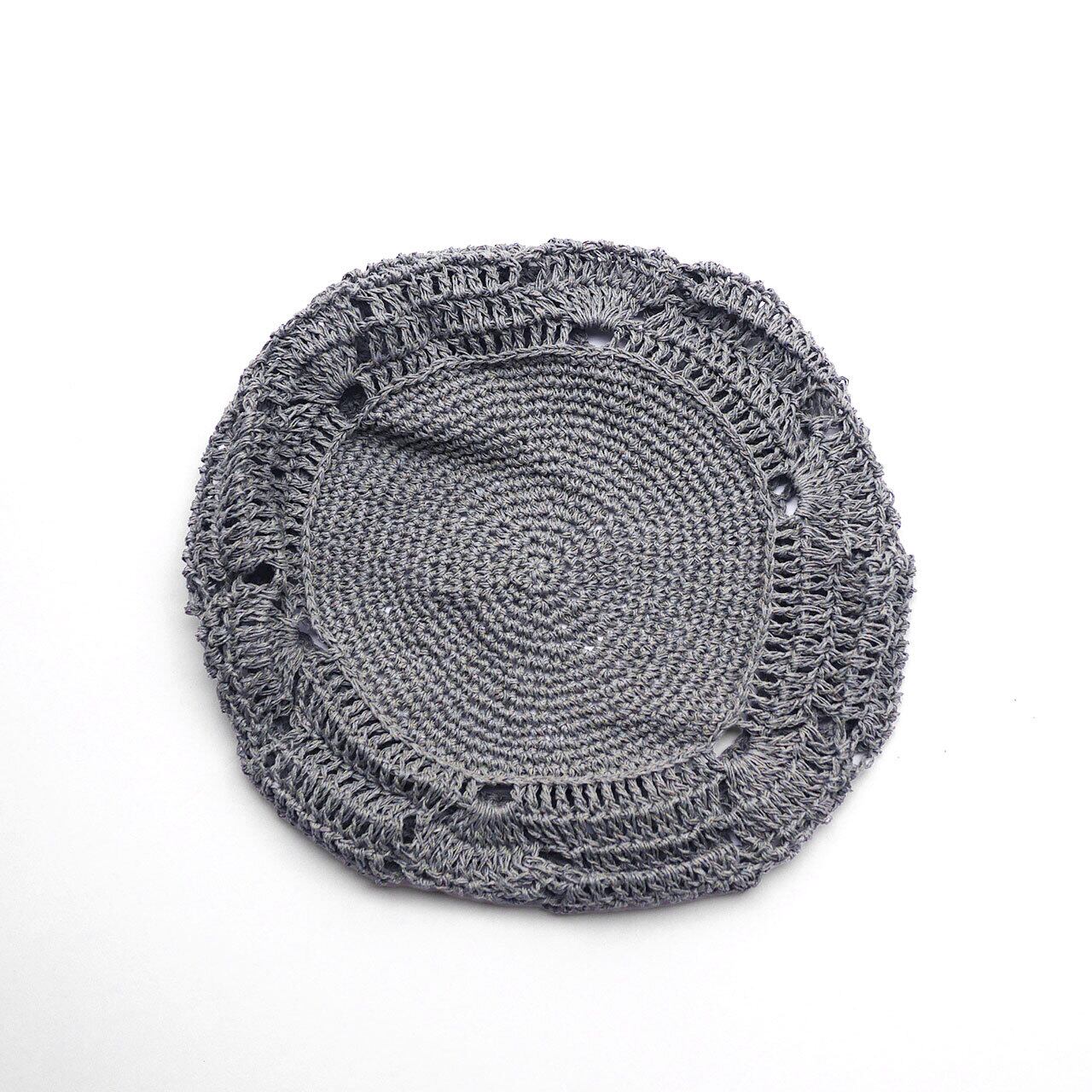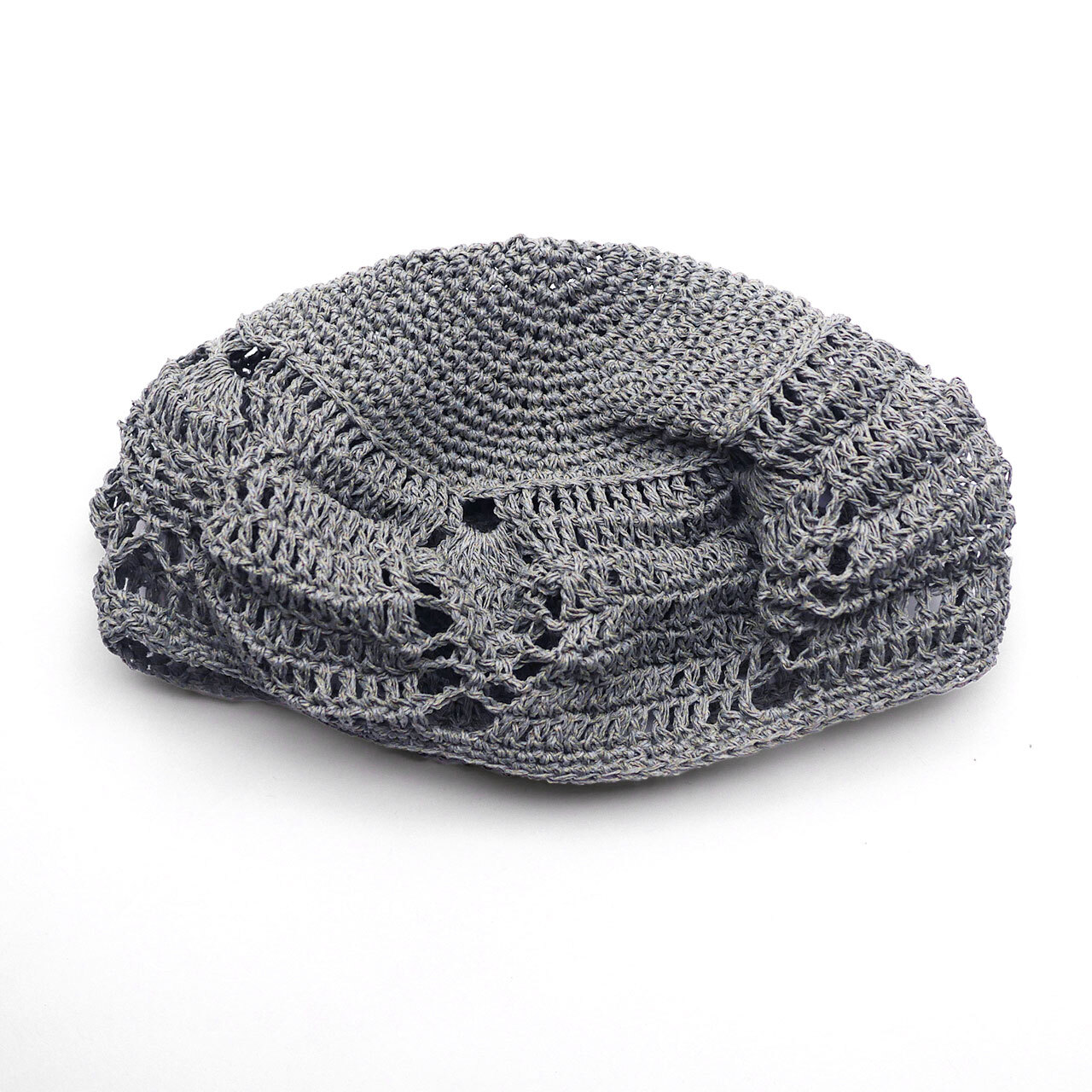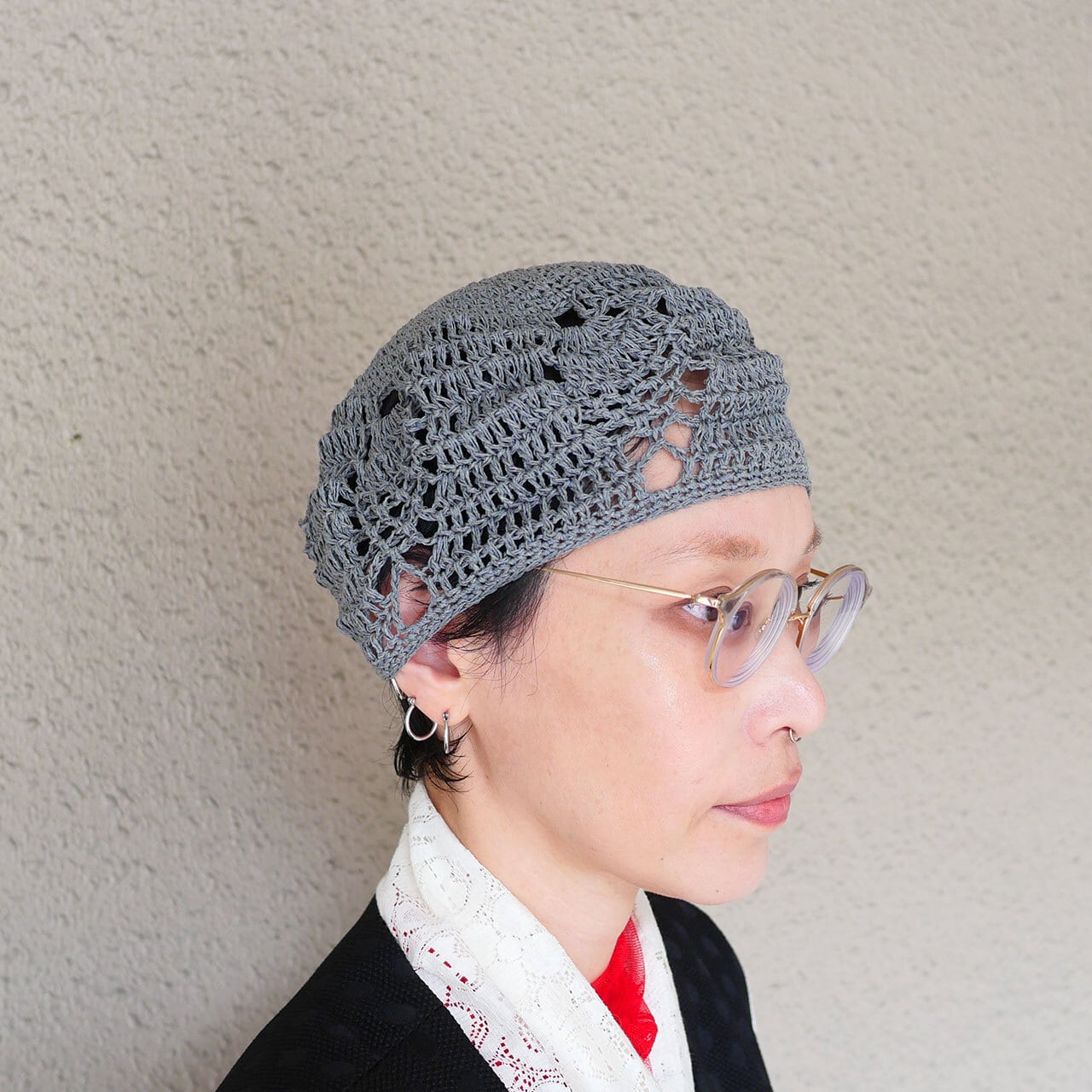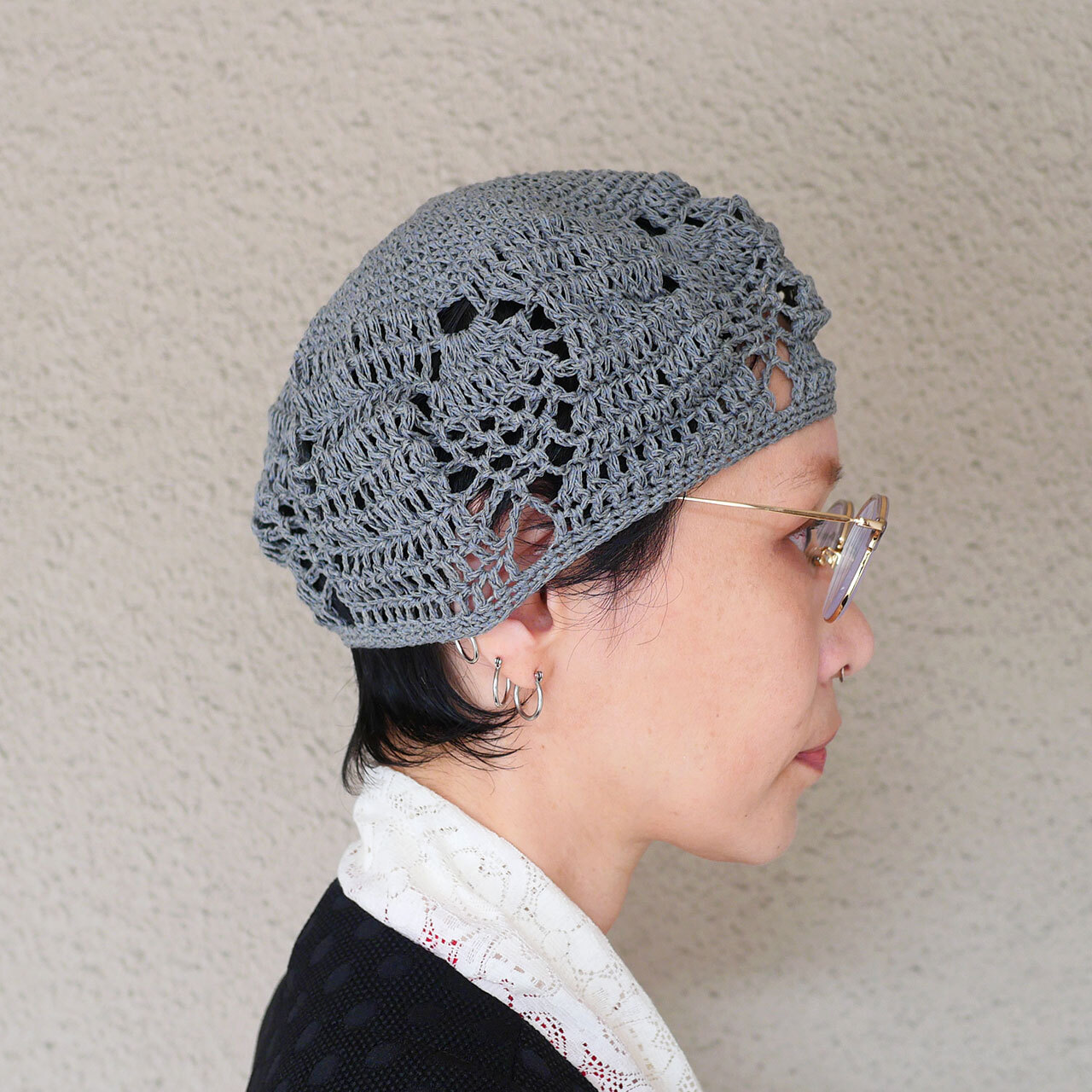 かぎ針の手編みで作成したタイトなベレーです。美濃和紙混コットンの糸を使用していますので、オールシーズン使用していただけます。側面には目の粗いパイナップル柄が編み込まれていますので、通気性もよく快適に被っていただけます。冬には、ベレーの上に三角巾やスカーフを巻いても素敵です。