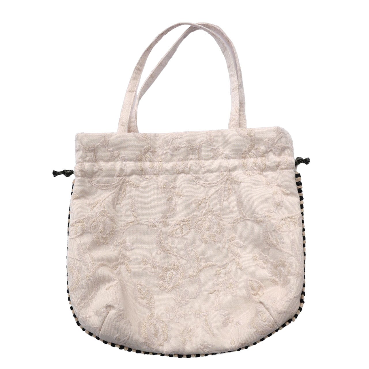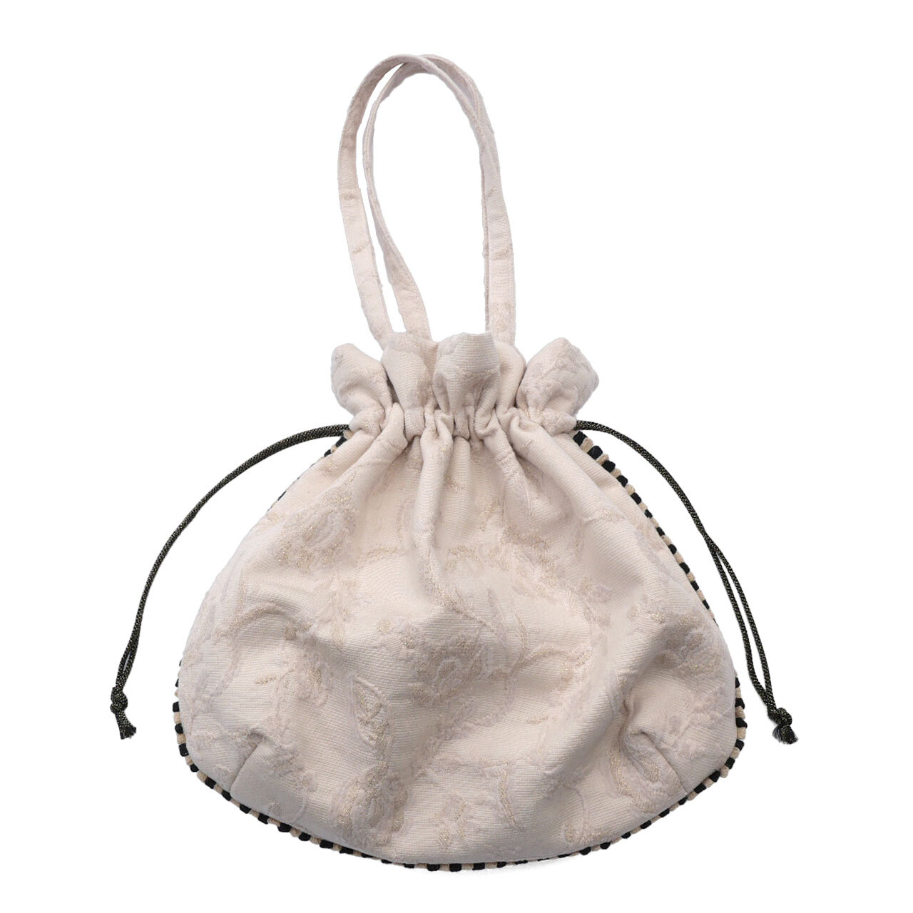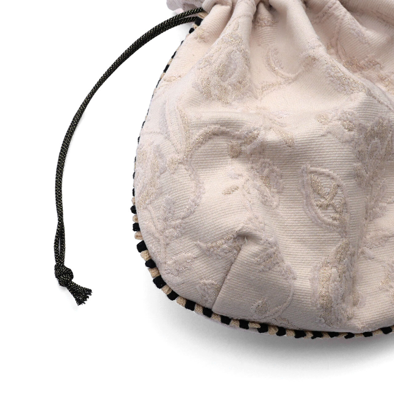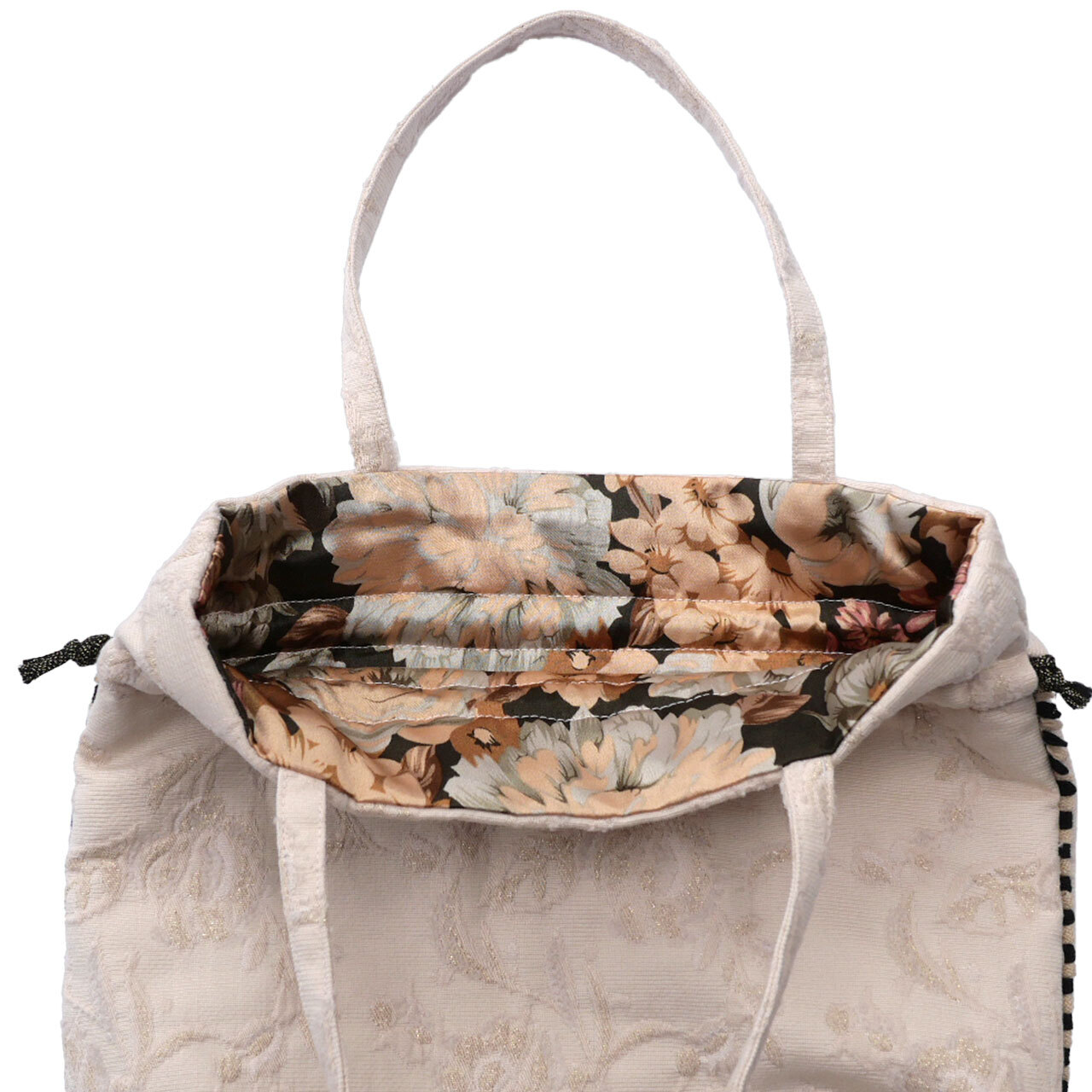 表地は、ピンクベージュの花柄ジャガード地に、裏地は花柄サテン地を使用しています。パイピングはベージュ×黒の2色使いです。