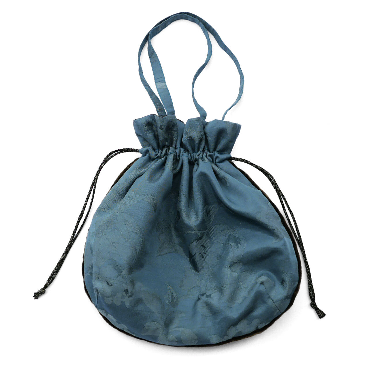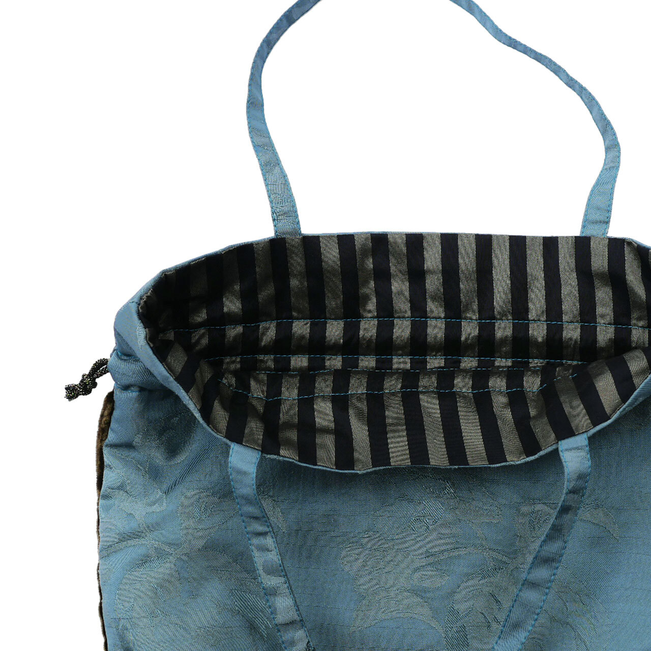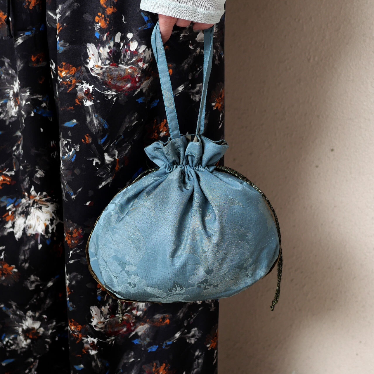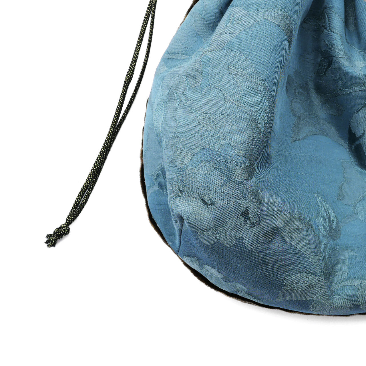 表地は、緑青色の花柄ジャガード地に、裏地はシルク混のストライプ地を使用しています。パイピングは錆茶色です。