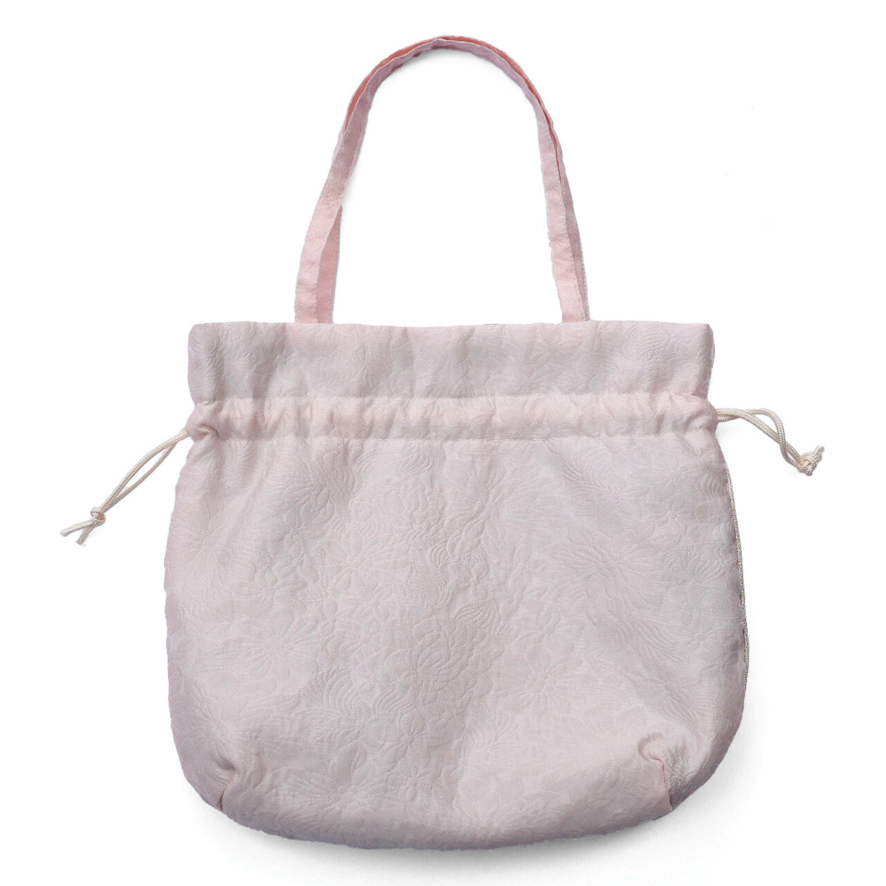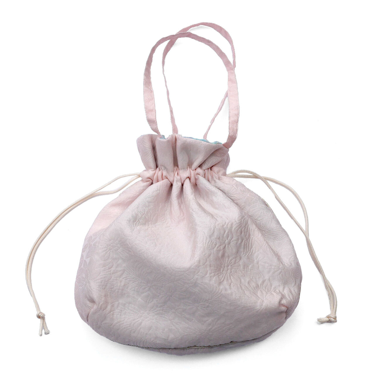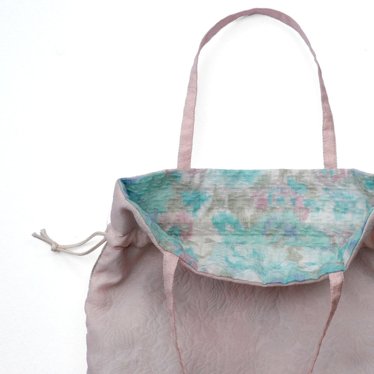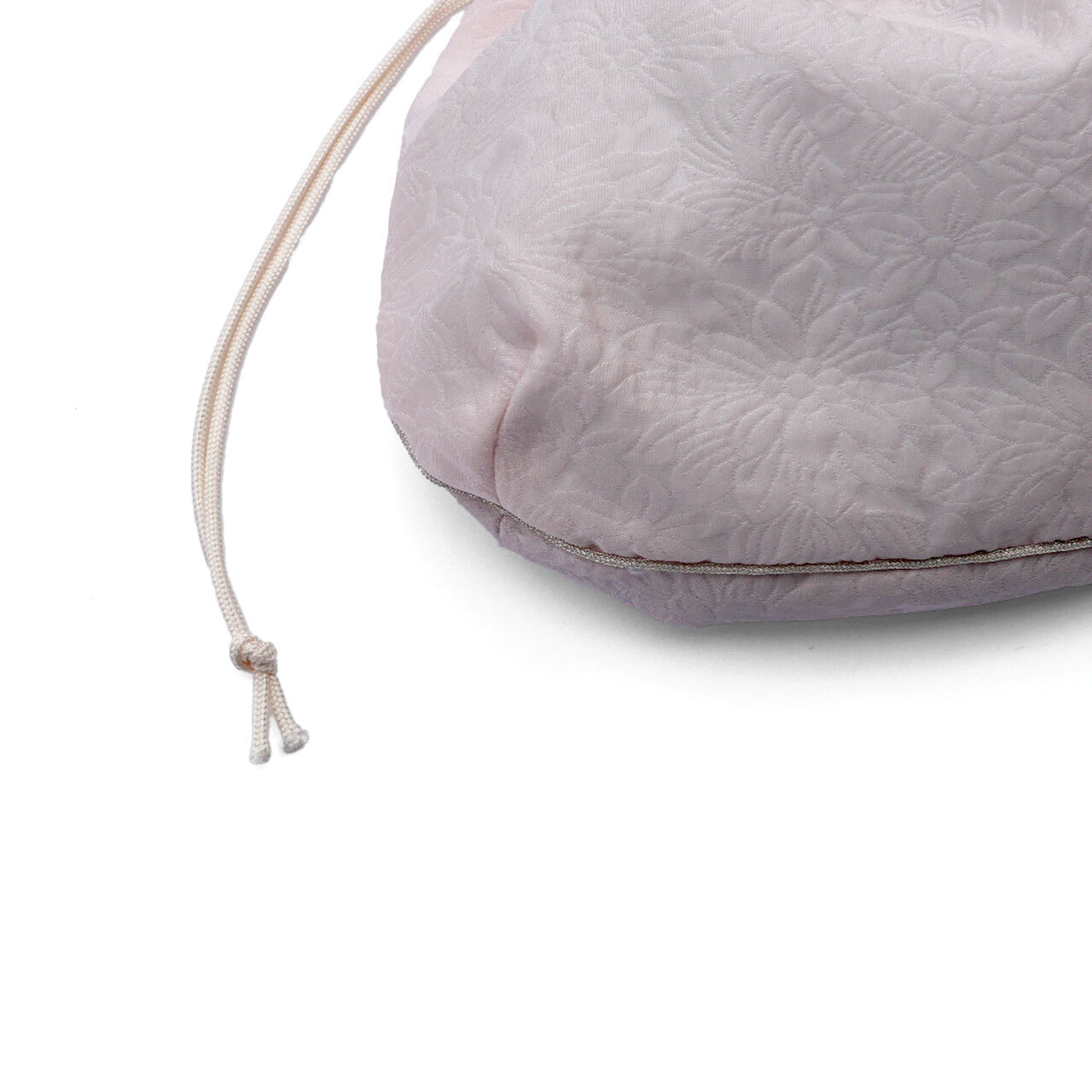 表地は、薄ピンク色の花柄地に、裏地は格子状に抽象的なペールトーンの花模様生地を使用しています。パイピングは銀色です。