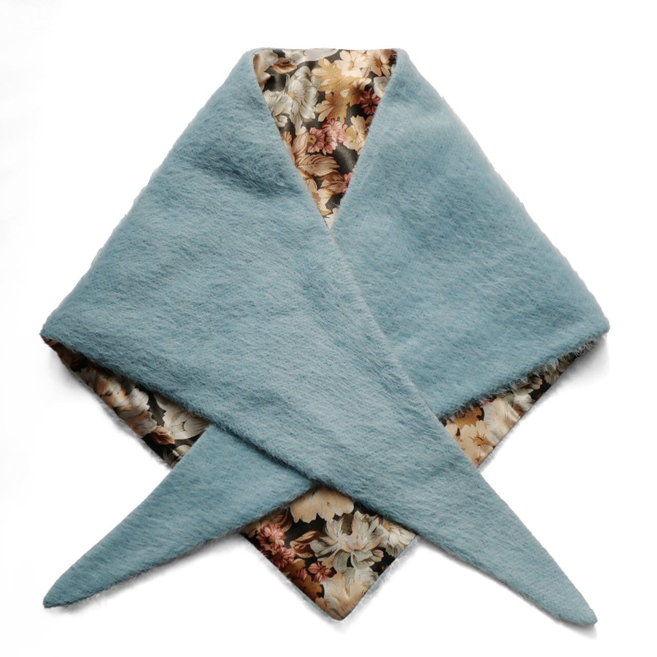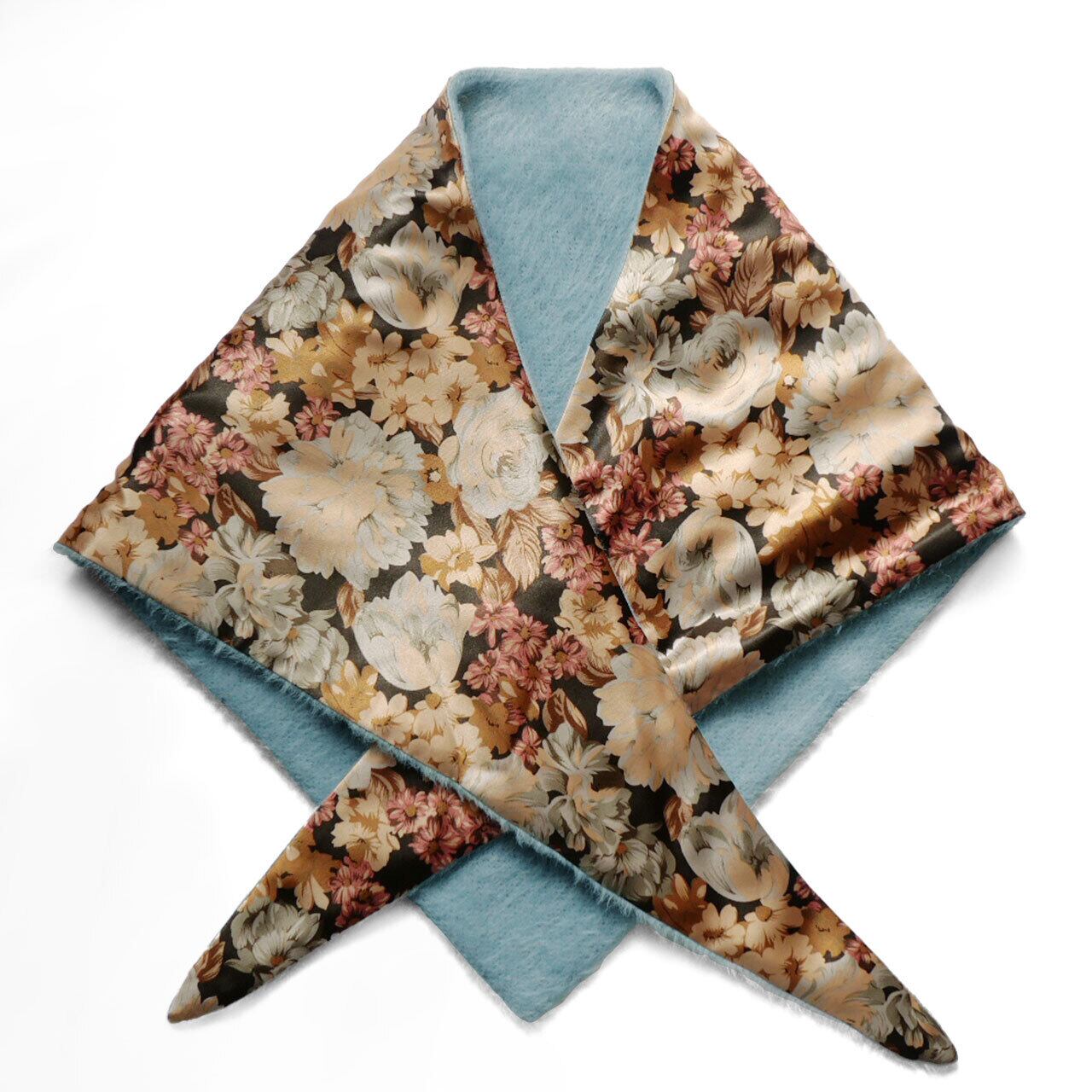 肌触り抜群のスモーキーなサックスブルーのシャギーウールと、どこかレトロな花柄のサテン生地の組み合わせです。素材感がかなり違うので、リバーシブル使いがかなり楽しい三角巾です。