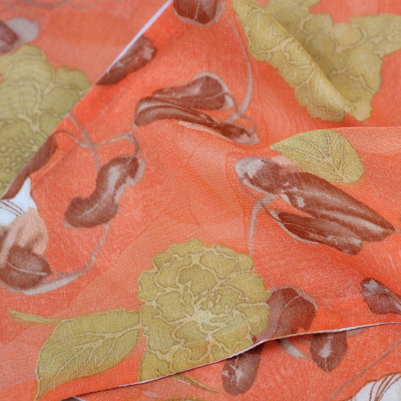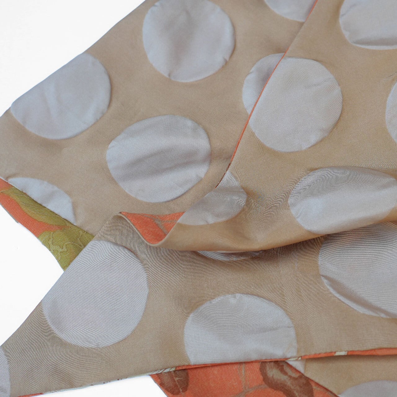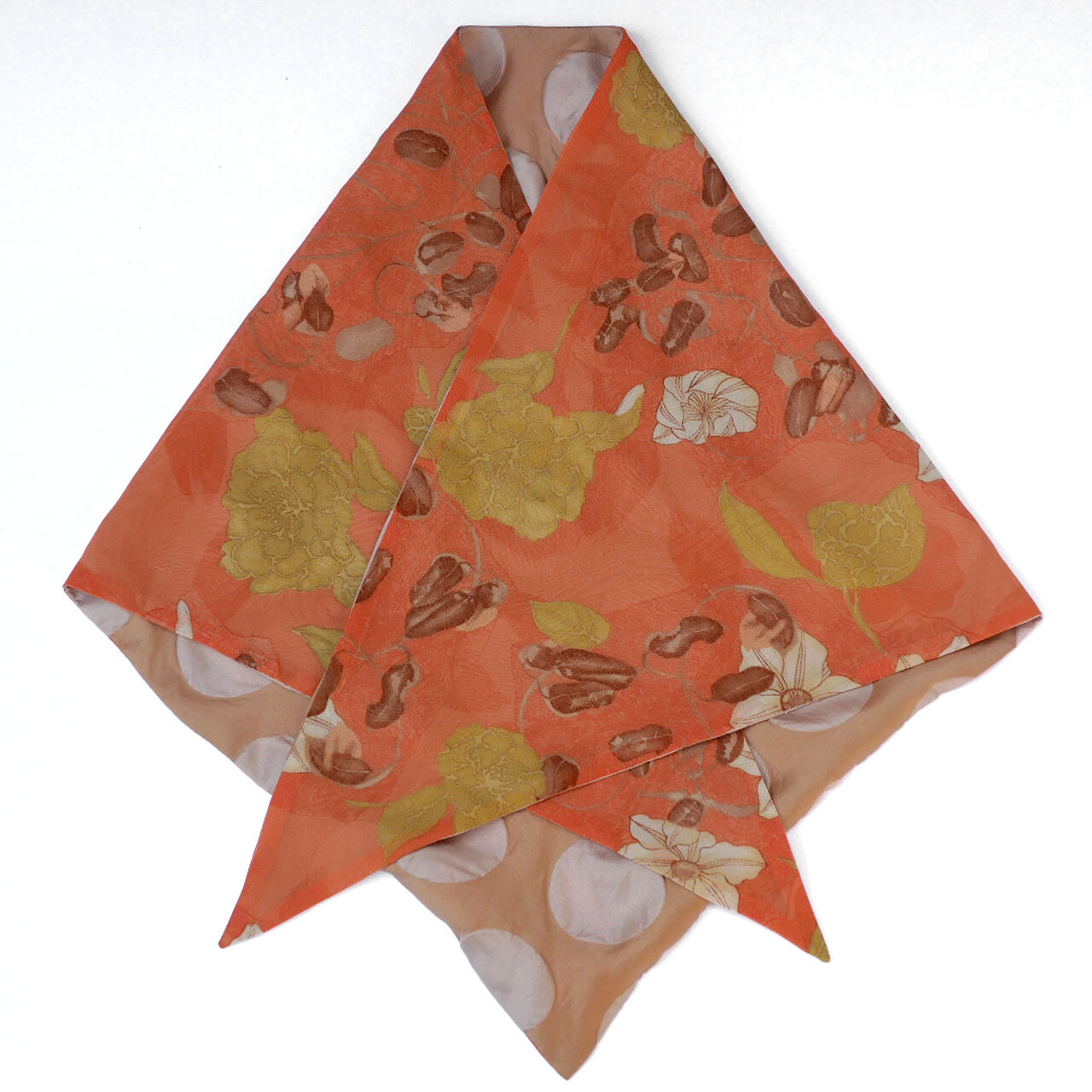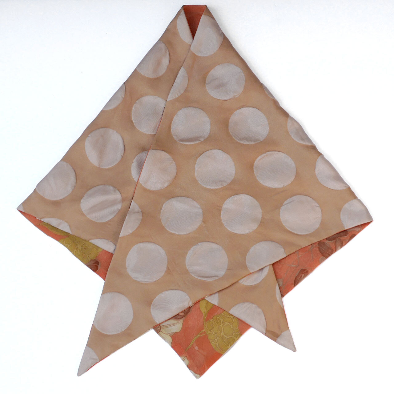 オレンジベースにオリエンタルな花柄が描かれたポリエステルシフォンと、ベージュの大きなドットがポコポコと立体的な、塩縮加工のポリエステルタフタで仕立ててあります。表裏両面使用可能です。