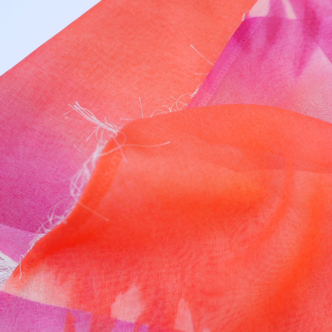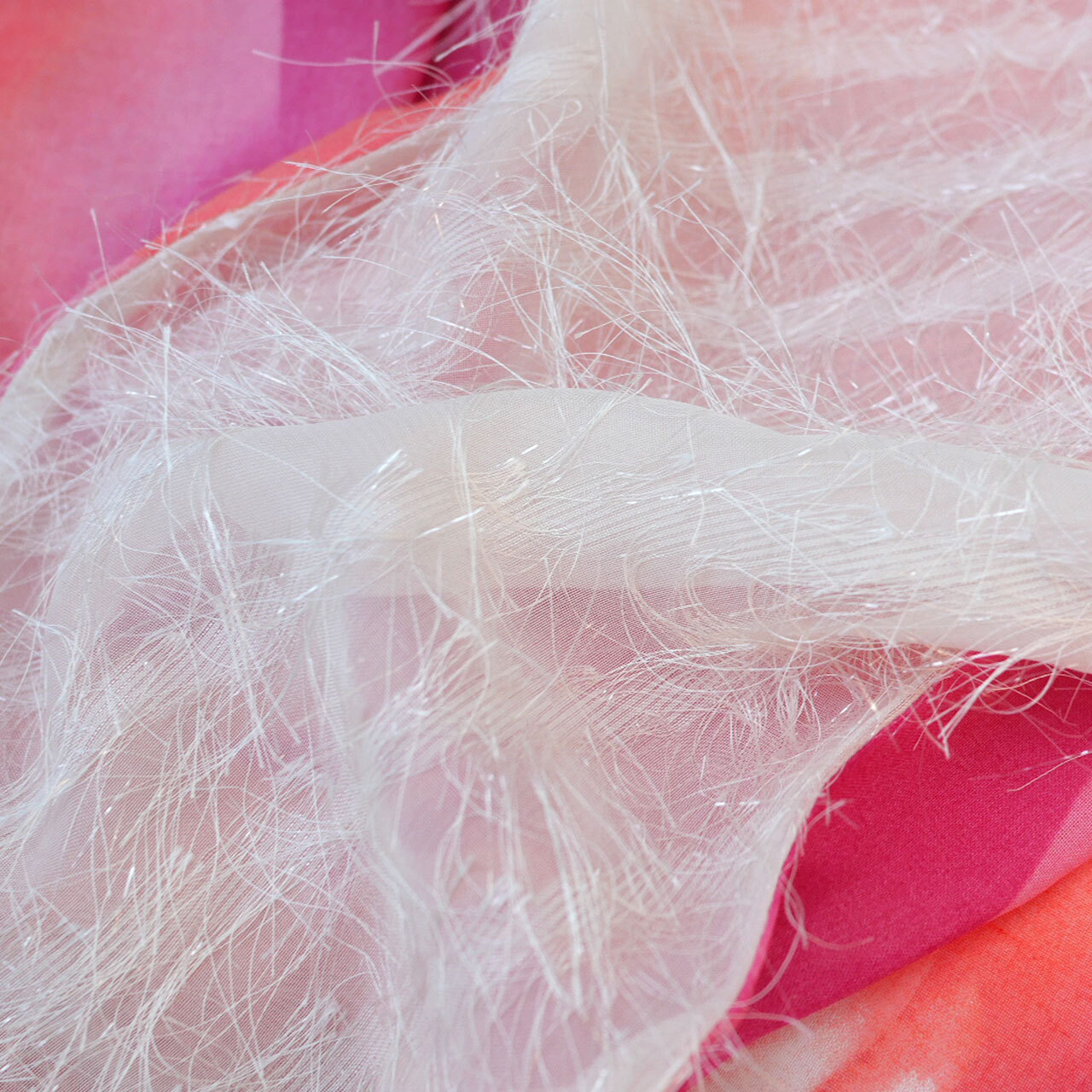 クリアラメとフリンジがふわふわ揺れる、透け感のあるベージュのカットジャガードと、裏面のオレンジからピンクの滲んだようなグラデーションプリントが透けて見えて美しい生地で仕立ててあります。表裏両面使用可能です。