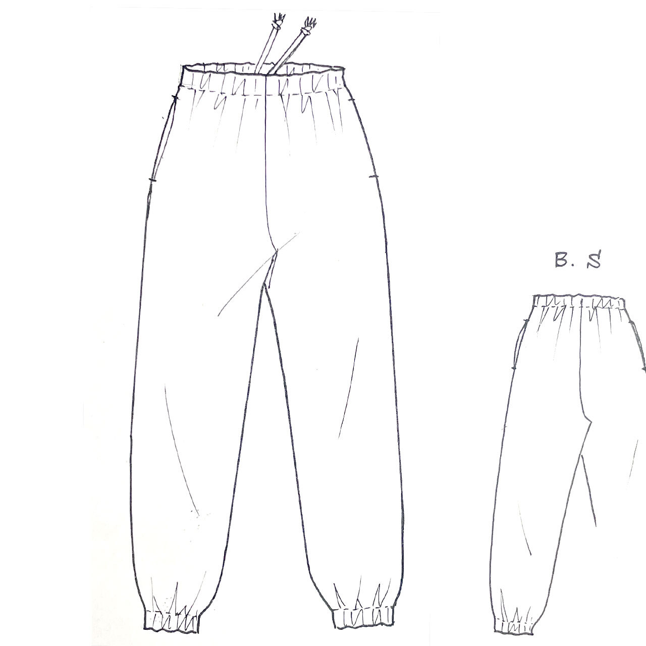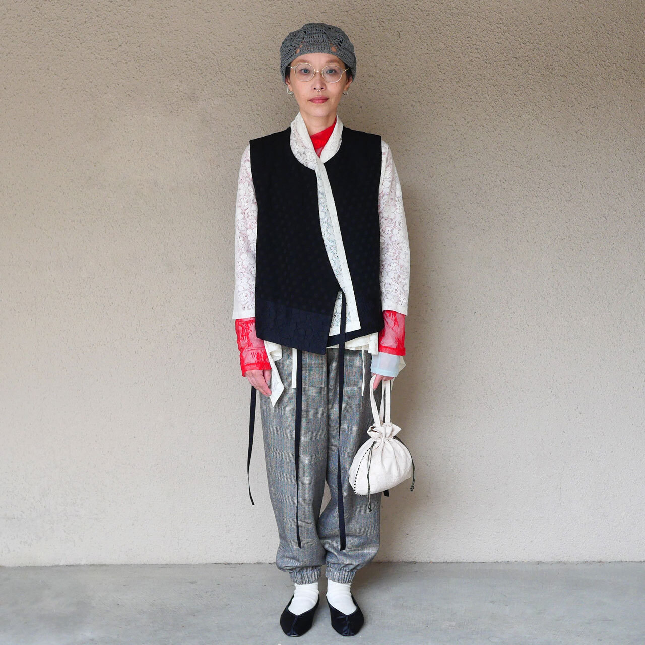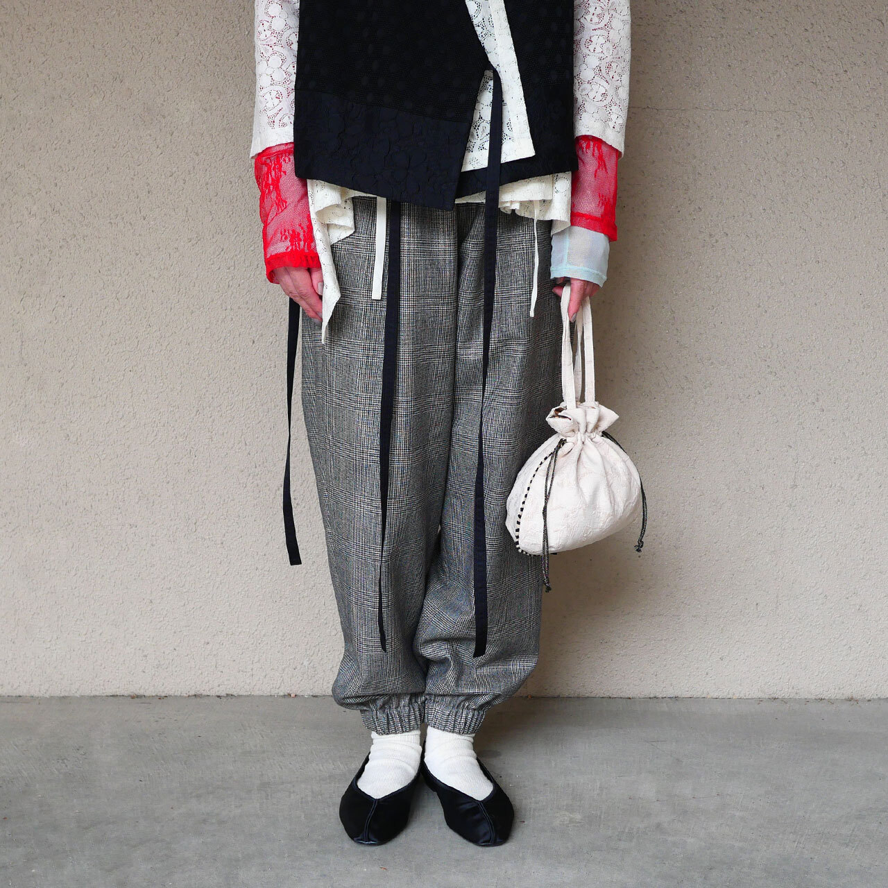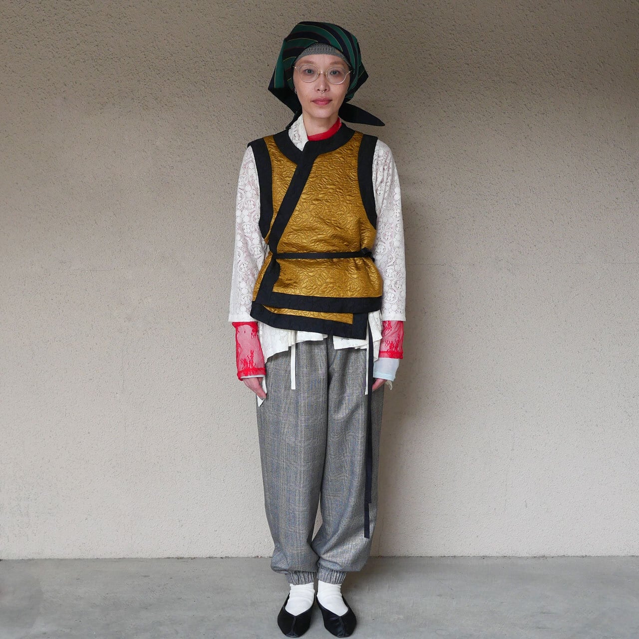茶系のウールベースのグレンチェックに、うっすらとゴールドの全面箔プリントが施された、非常に珍しい生地。トラッドなだけではない、華やかな印象の生地で仕立てたもんぺ風のラフなパンツです。オレンジと黒のシャンブレータフタで裏地をつけ、長いシーズン着用可能です。