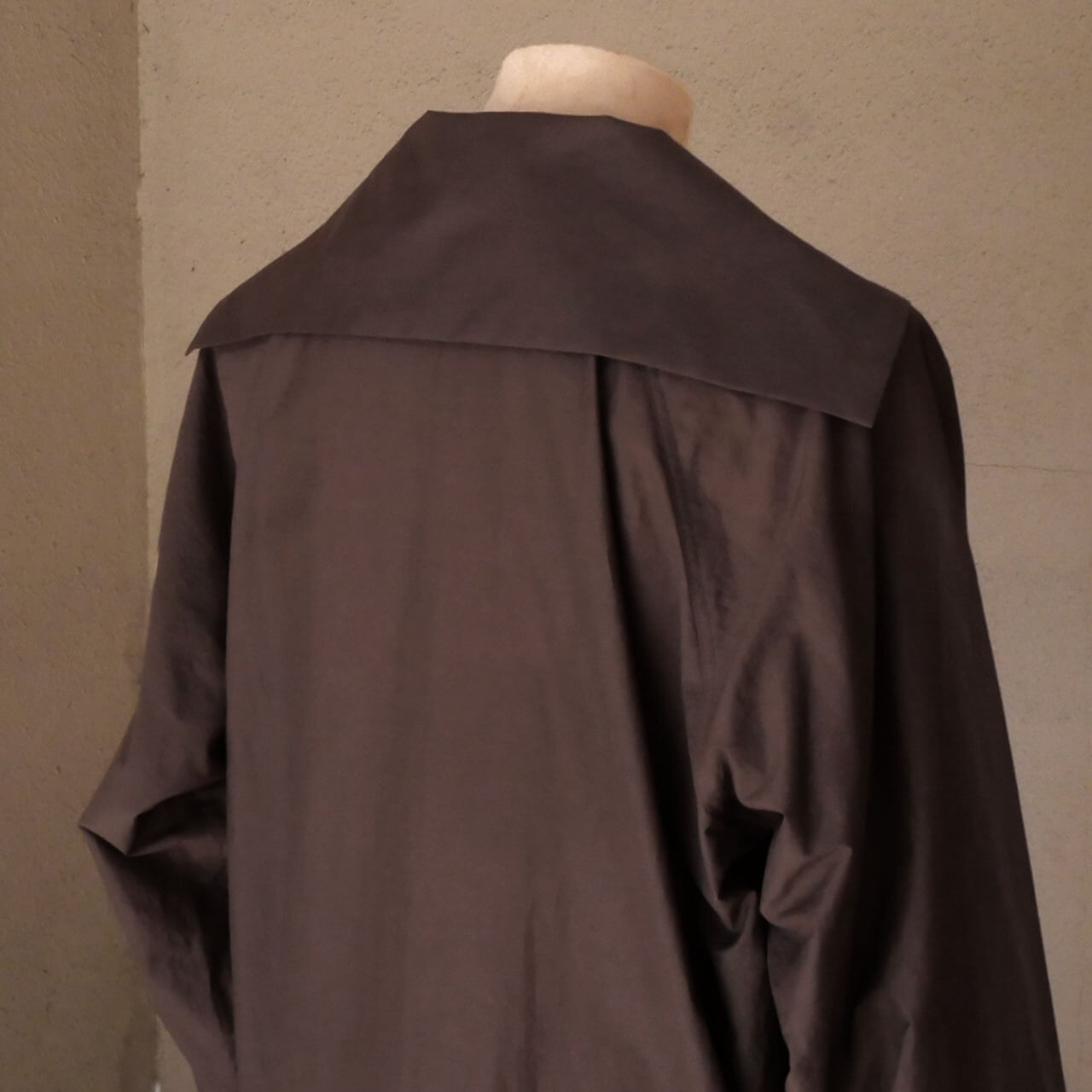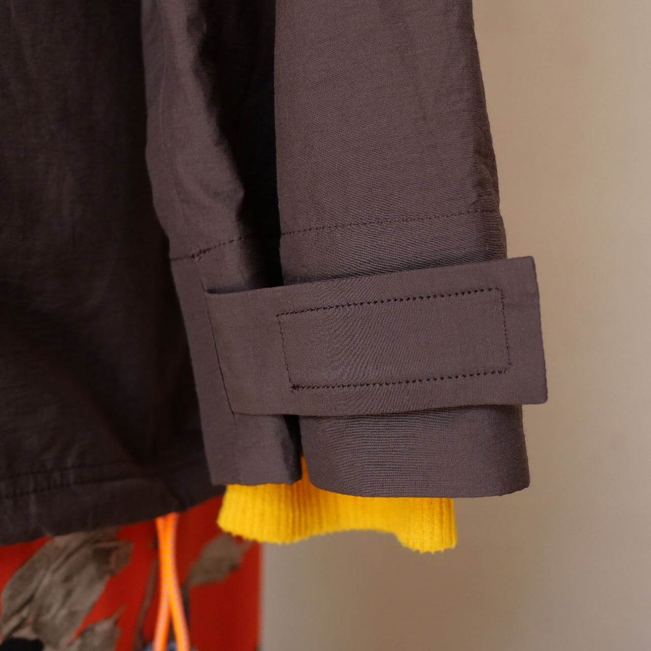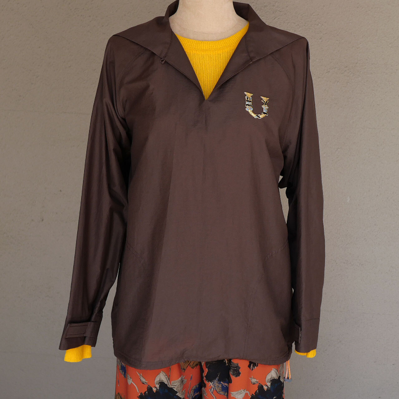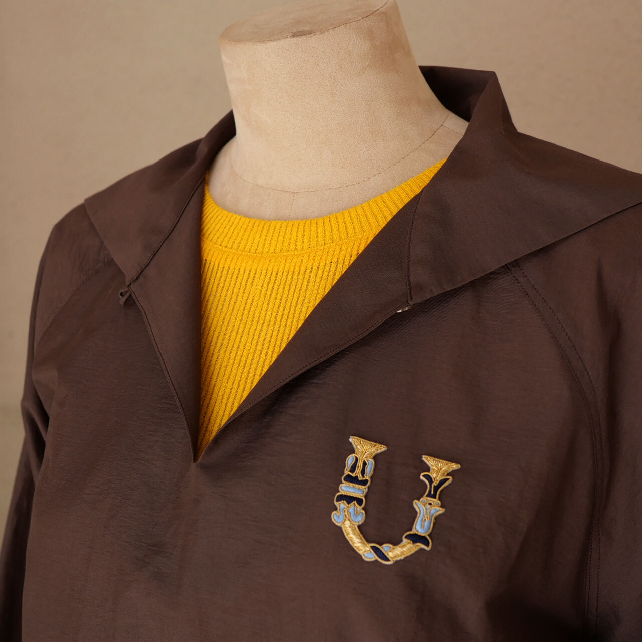 顔映り良く色合わせしやすい、絶妙なチョコレート色の綿ポリエステルタフタ生地で仕立ててあり、襟はセーラーカラー仕様で、ケルト地方の全寮制の学校の制服のような佇まいと、アノラックのスポーティな佇まいを併せ持っています。袖はマジックテープで、裾はスピンドルで絞ることが可能です。