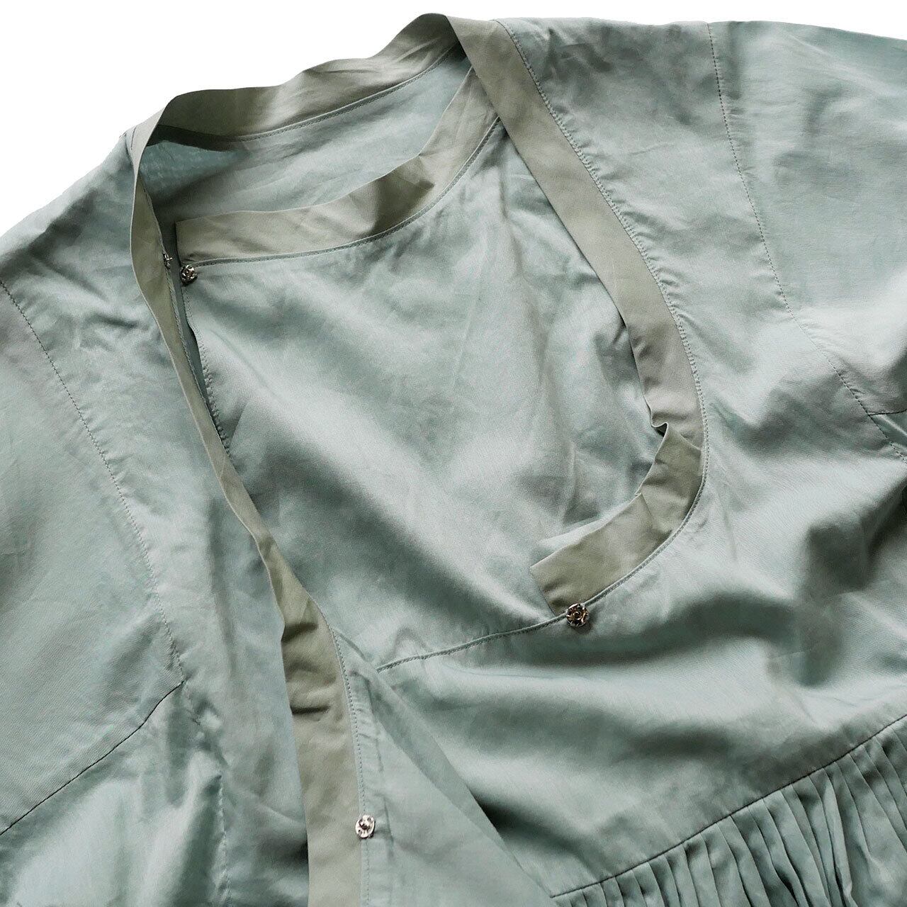 淡いブルーグリーンの薄手のコットンシルク生地を、ワンウォッシュして自然なシワ感を出しています。