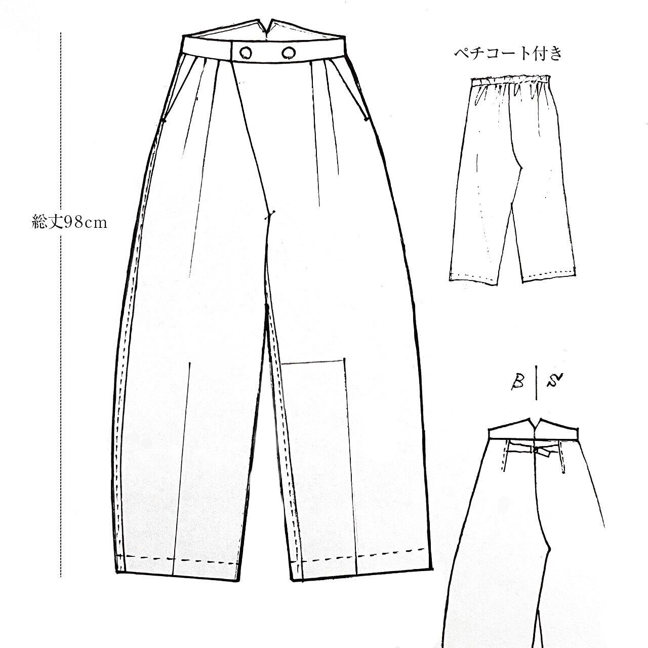 2タックと裾のダーツで、立体的に膨らむ履くととても綺麗なラインのワイドシルエット。後ろのバッグベルトでサイズ調節可能です。両脇ポケットあり。