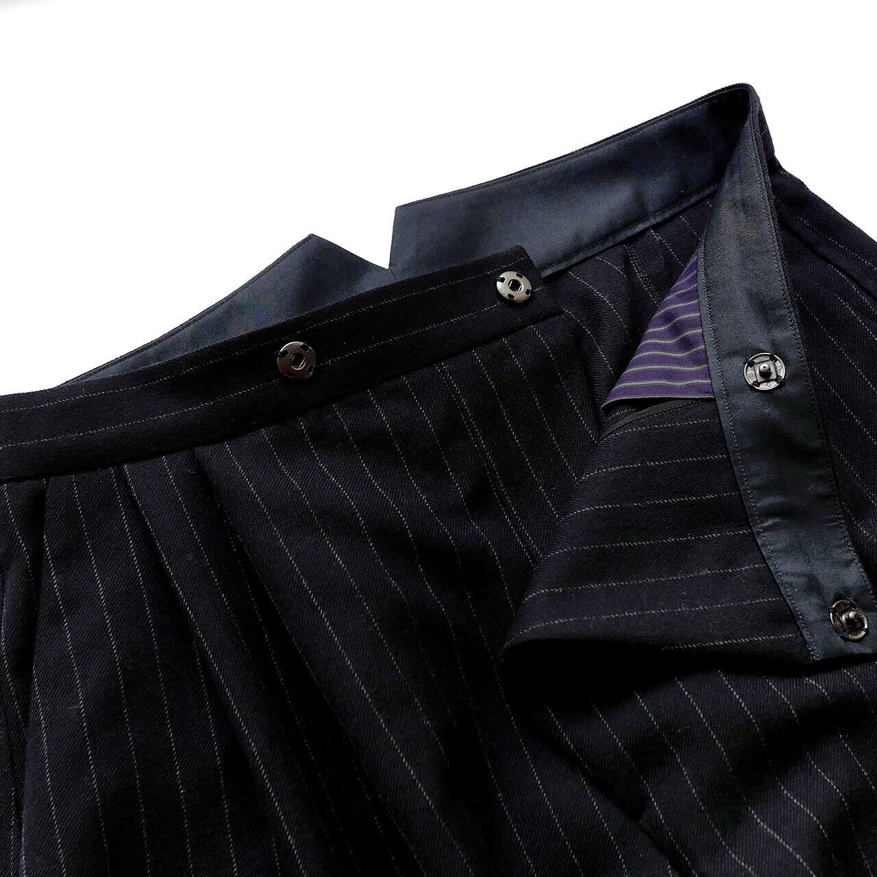 濃紺に白のピンストライプの中薄のウール地を使用。左側に配した膝当てのように見えるカーキ色は、プリントで表現されています。