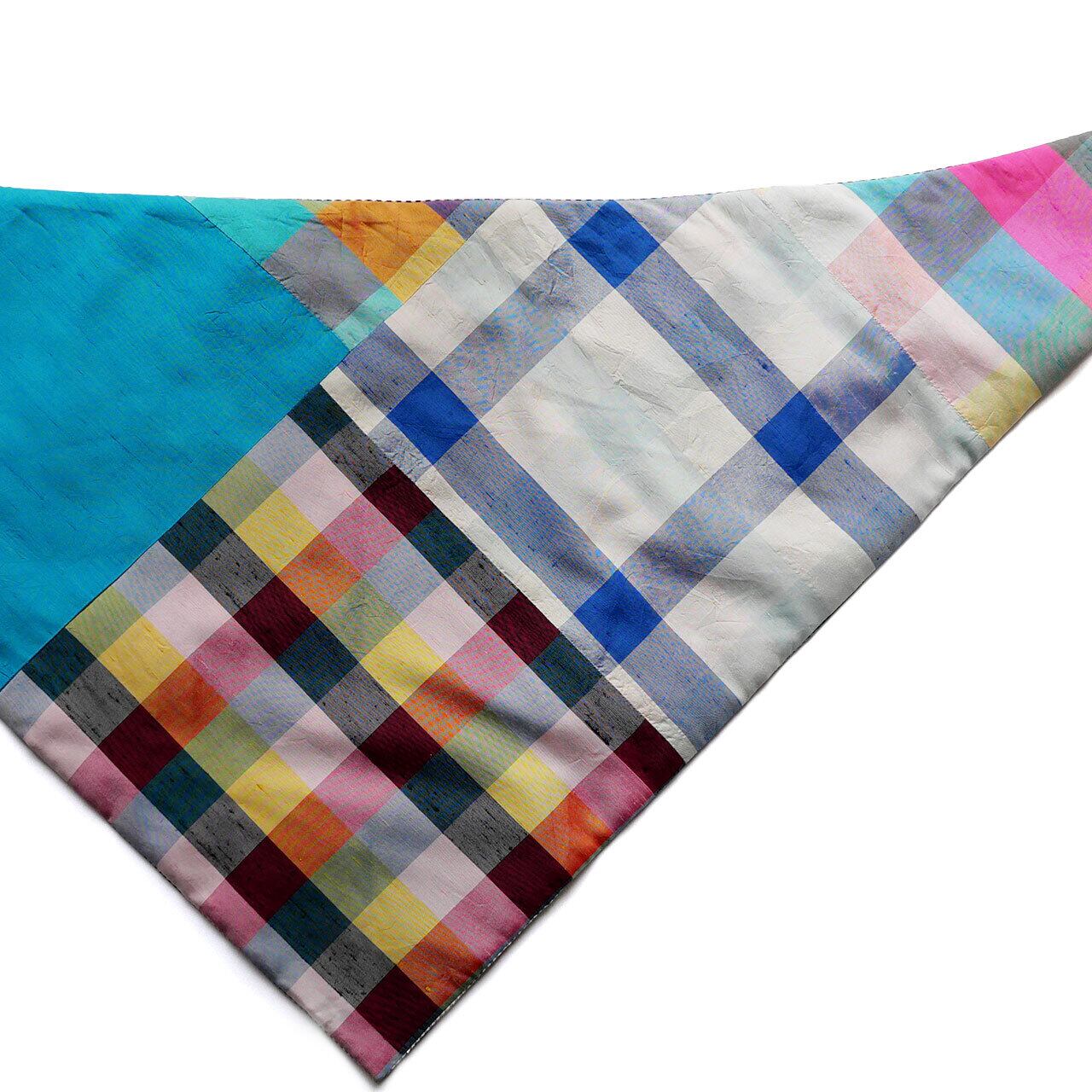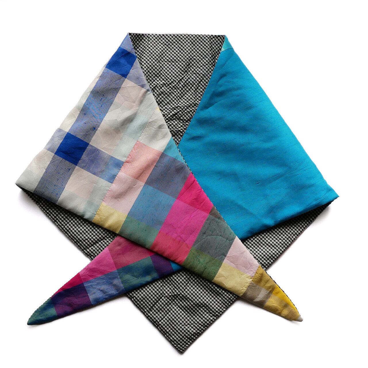 どことなく、韓国でよく見る色合わせのしなやかなシルクシャンタンのパッチワーク。両面使えるので、服のコーデによって変えてみるととても楽しいです。