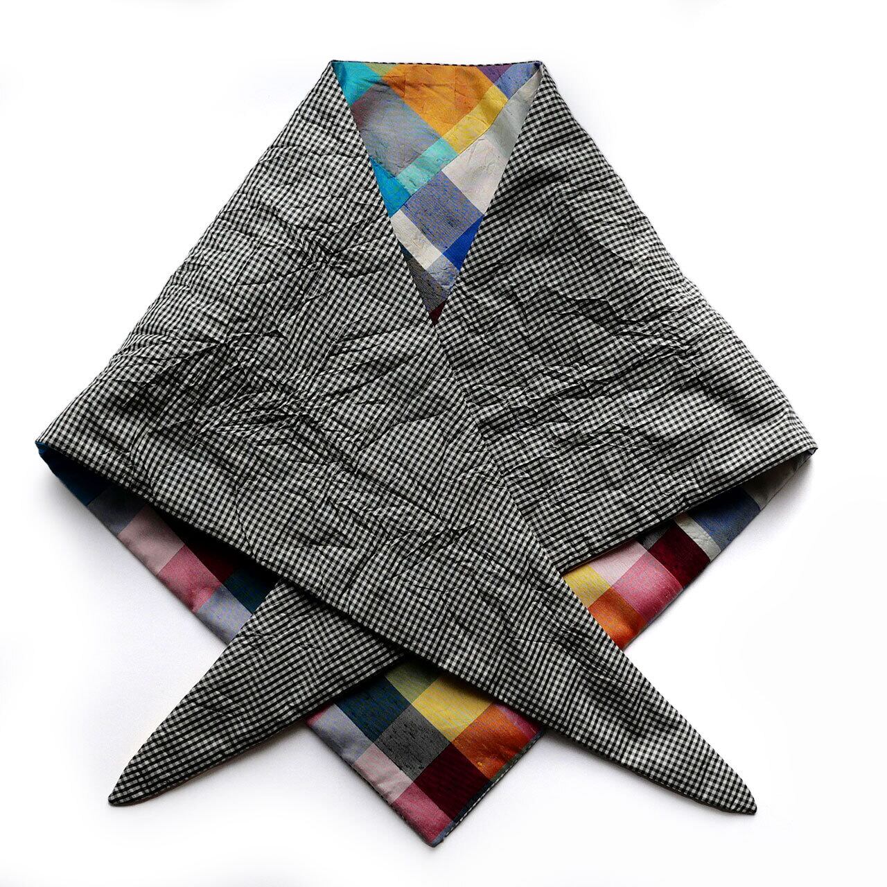 デッドストックのシルクシャンタンをパッチワークした、1点もの。片面はシワ加工のある細かいギンガムチェック生地との組み合わせ。両面使用可能。