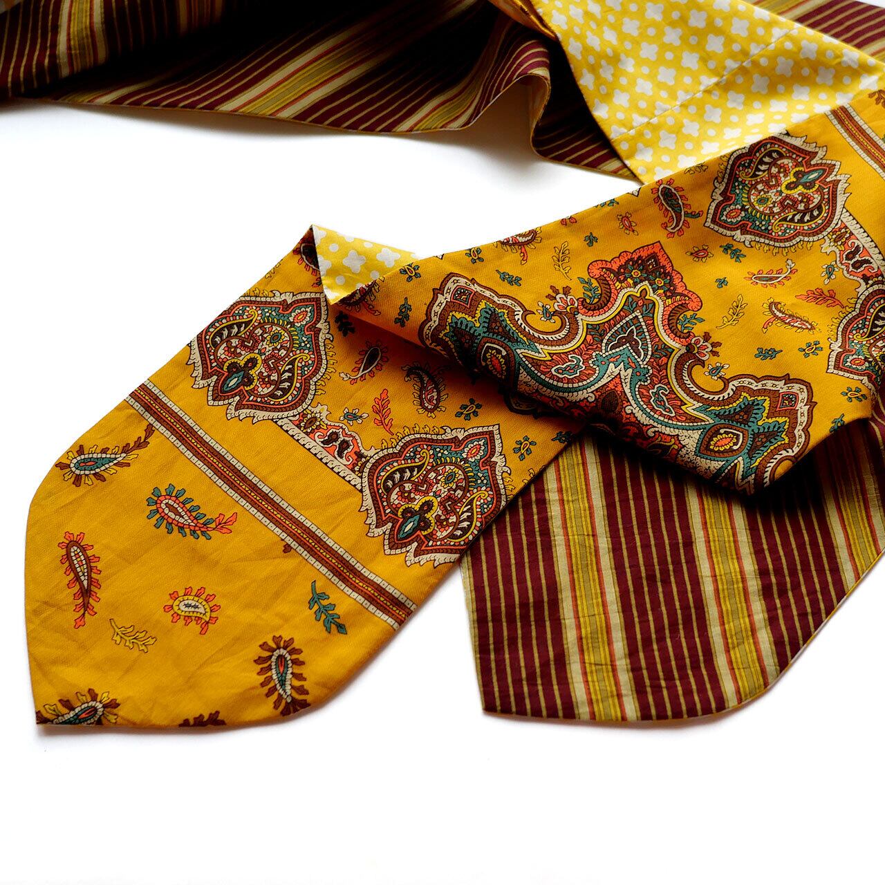 3種のイエロー系の柄生地を使用していて、ペイズリーやドット、ストライプがエスニックな雰囲気をもたらしています。