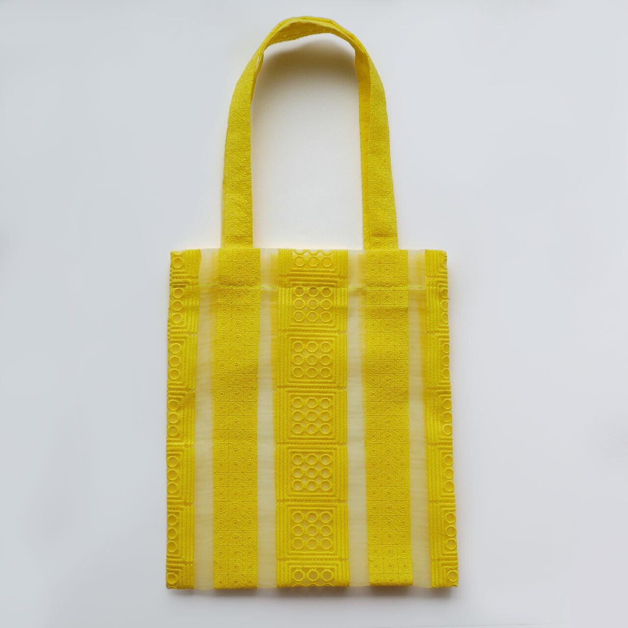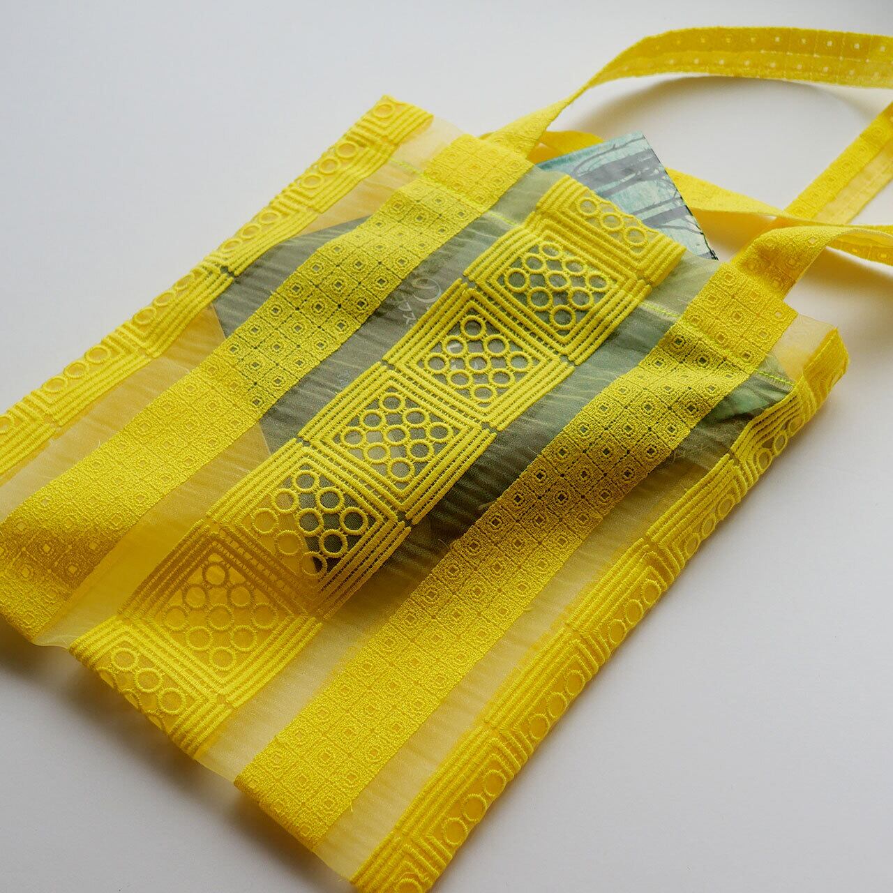 透明感のあるイエローオーガンジーに幾何学的な刺繍のシアーなミニトートバッグ。