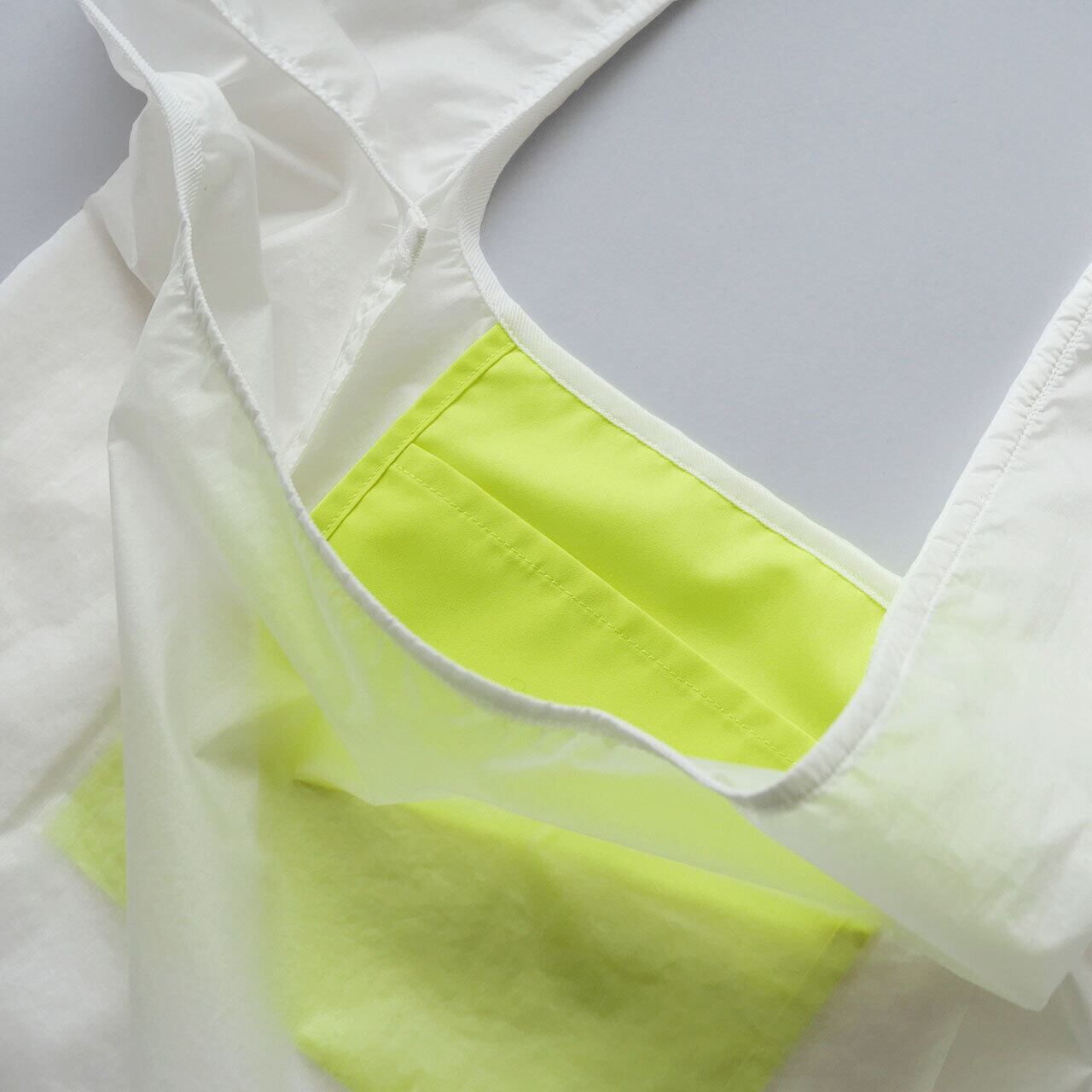 スポーツウェアなどに使用される極薄のナイロンタフタ。コーティング加工により軽い撥水性が有り、磨りガラスのような質感です。内ポケットのネオンイエローがぼんやりと透けて見える、空気のように軽く極薄素材なのに、とても丈夫なバッグです。