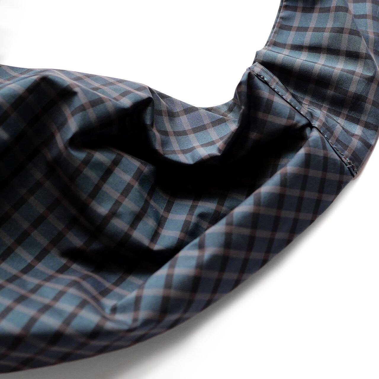 ポリエステルのブルーとブラックのチェック生地で、シャリ感があり形を作りやすいヘアバンドです。後ろにリボンがありサイズ調整も可能です。