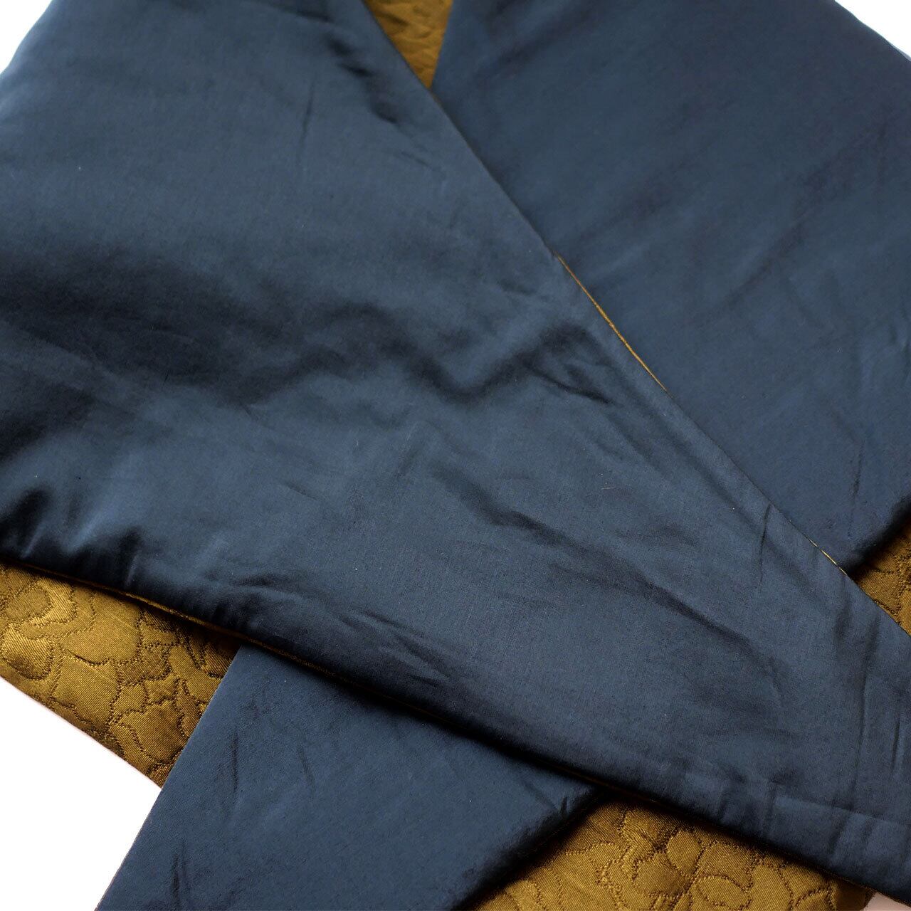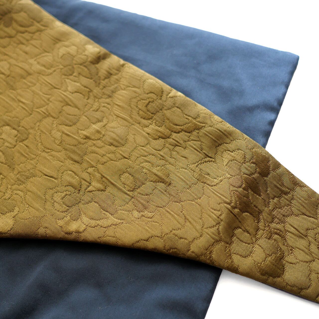 光沢のあるオリーブ色のふくれジャカードは、ぷくぷくと立体的に花柄が織り込まれた柔らかな素材。裏面は無地のピーコックグリーンとのリバーシブル。もちろん両面使用可能です。